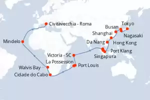 Itinerário : Marselha, Barcelona, Funchal, Bridgetown, Granada, Curaçao (Willemstad), Cartagena, Puerto Limon, Canal do Panamá, Canal panama (Enter), Puntarenas, Puerto Quetzal, Porto Vallarta, Cabo San Lucas, San Diego, Los Angeles, Hilo, Pago Pago, Apia, Suva, Auckland, Wellington, Sydney, Townsville, Cairns, Manilha, Keelung, Ishigaki, Naha, Tokyo, Nagasaki, Busan, Shanghai, Hong Kong, Da Nang, Singapura
