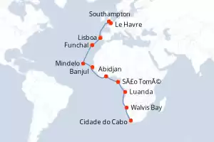 Itinerário : Cidade do Cabo, Walvis Bay, Luanda, São Tomé, Abidjan, Banjul, Mindelo, Funchal, Lisboa, Le Havre, Southampton