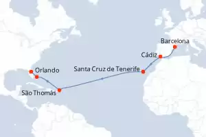 Itinerário : Barcelona, Cádiz, Santa Cruz de Tenerife, São Thomás, Great Stirrup Cay, Orlando