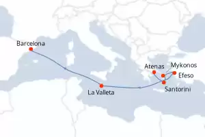 Itinerário : Barcelona, La Valleta, Efeso, Mykonos, Santorini, Pireus Atenas