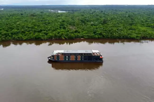 O seu tamanho controlado permite-lhe aceder às zonas remotas da reserva Pacaya Samiria, proporcionando assim um ambiente de exploração intimista e exclusivo. A bordo, os espaços comuns distribuem-se por três conveses, onde cada zona foi pensada para oferecer conforto e imersão: um sundeck à proa com piscina de borda infinita, cabanas sombreadas com bar lounge, uma sala de leitura e biblioteca com design elegante, uma sala de projeção, bilhar, um ginásio panorâmico com vista para o rio, duas cabines de spa, uma enfermaria e uma loja dedicada ao artesanato local. Para garantir um conforto ideal a bordo, o navio está equipado com tecnologia de ponta: geradores silenciosos Caterpillar de norma Tier 3, ar condicionado central e sistema elétrico fiável de 220 volts.