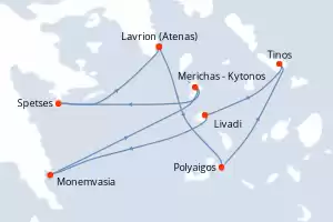 Itinerário : Lavrion (Atenas), Polyaigos, Tinos, Livadi, Monemvasia, Merichas - Kytonos, Spetses, Lavrion (Atenas)