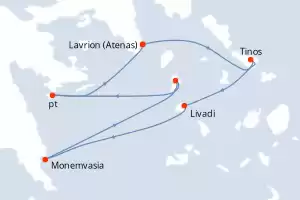 Itinerário : Lavrion (Atenas), Polyaigos, Tinos, Livadi, Monemvasia, Merichas - Kytonos, Spetses, Lavrion (Atenas)