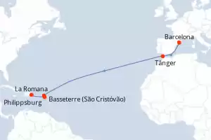 Itinerário : Barcelona, Tânger, Saint Johns, Philippsburg, Basseterre (St Kitts), La Romana, Ilha Catalina, Bridgetown