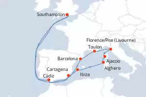 Itinerário : Southampton, Cádiz, Barcelona, Toulon, Florence/Pise (Livourne), Ajaccio, Alghero, Ibiza, Cartagena, Southampton