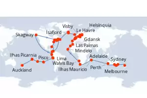 Itinerário : Auckland, Sydney, Melbourne, Adelaide, Perth, Ilhas Mauricio, Cidade do Cabo, Walvis Bay, Mindelo, Las Palmas, Casablanca, A Corunha, Le Havre, Bruges, Gdansk, Visby, Helsínquia, Tallin, Estocolmo, Copenhaga, Ijmuiden, Dover, Lerwick, Reiquejavique, Grundarfjordur, Isafjord, St Johns, Corner Brook, Quebec, Skagway, Charlottetown, Sydney, Halifax, Nova Iorque, Miami, Cartagena, Gatun, Manta, Lima, Pisco, Hango Roa - Ilha de Páscoa, Ilhas Picarnia, Papeete, Moorea, Auckland