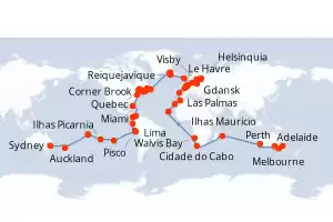 Itinerário : Sydney, Melbourne, Adelaide, Perth, Ilhas Mauricio, Cidade do Cabo, Walvis Bay, Mindelo, Las Palmas, Casablanca, A Corunha, Le Havre, Bruges, Gdansk, Visby, Helsínquia, Tallin, Estocolmo, Copenhaga, Ijmuiden, Dover, Lerwick, Reiquejavique, Grundarfjordur, Isafjord, St Johns, Corner Brook, Quebec, Saguenay, Charlottetown, Sydney, Halifax, Nova Iorque, Miami, Cartagena, Gatun, Manta, Lima, Pisco, Hango Roa - Ilha de Páscoa, Ilhas Picarnia, Papeete, Moorea, Auckland, Sydney
