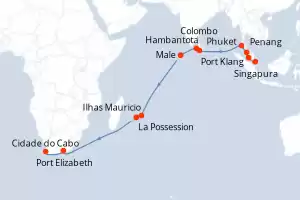 Itinerário : Singapura, Port Klang, Penang, Phuket, Hambantota, Colombo, Male, Ilhas Mauricio, La Possession, Port Elizabeth, Cidade do Cabo