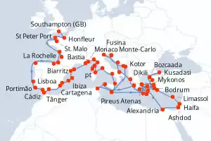 Itinerário : Southampton, Honfleur, St Peter Port, St. Malo, La Rochelle, Bordeaux, Biarritz, Bilbao, A Corunha, Lisboa, Portimão, Cádiz, Tânger, Málaga, Cartagena, Alicante, Ibiza, Palma de Maiorca, Barcelona, Palamos, Saint Tropez, Monaco Monte-Carlo, Portofino, Florence/Pise (Livourne), Ajaccio, Bastia, Golfo Aranci, Civitavecchia - Roma, Salerno, Messina, La Valleta, Kotor, Dubrovinik, Rijeka, Fusina, Rijeka, Split, Bari, Igoumenitsa, Katakolon, Monemvasia, Mykonos, Pireus Atenas, Chania, Santorini, Mykonos, Bodrum, Kusadasi, Dikili, Bozcaada, Istambul, Rodas, Limassol, Haifa, Ashdod, Alexandria, Pireus Atenas, Mykonos, Katakolon, Trapani, La Goulette, La Valleta, Heraklion, Kusadasi, Pireus Atenas