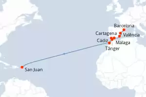 Itinerário : Barcelona, Valência, Cartagena, Málaga, Cádiz, Tânger, Casablanca, San Juan