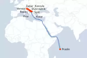 Itinerário : Veneza, Rovinj, Zadar, Praslin, Split, Hvar, Korcula, Mljet, Kotor, Dubrovinik