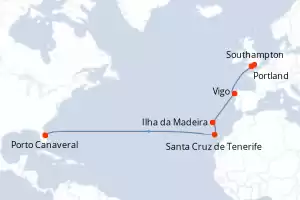 Itinerário : Southampton, Portland, Vigo, Ilha da Madeira, Santa Cruz de Tenerife, Porto Canaveral