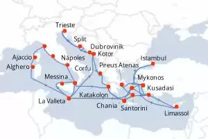 Itinerário : Pireus Atenas, Santorini, Chania, Katakolon, Messina, La Valleta, Mykonos, Kusadasi, Istambul, Kusadasi, Rodas, Mykonos, Chania, La Valleta, Palermo, Messina, Nápoles, Civitavecchia - Roma, Florence/Pise (Livourne), Ajaccio, Alghero, La Valleta, Kotor, Dubrovinik, Split, Trieste, Split, Kotor, Corfu, Katakolon, Chania, Santorini, Rodas, Limassol, Kusadasi, Pireus Atenas