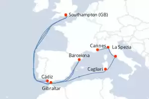 Itinerário : Southampton, Gibraltar, Cagliari, Civitavecchia - Roma, La Spezia, Cannes, Barcelona, Cádiz, Southampton