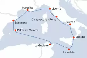 Itinerário : Barcelona, Marselha, Livorno, Civitavecchia - Roma, Salerno, Messina, La Valleta, La Goulette, Palma de Maiorca, Barcelona