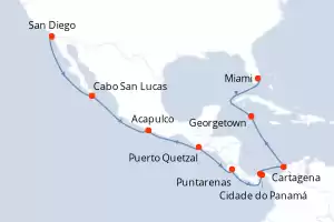 Itinerário : San Diego, Cabo San Lucas, Acapulco, Puerto Quetzal, Puntarenas, Cidade do Panamá, Canal do Panamá, Cartagena, Georgetown, Miami