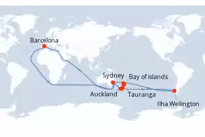 Itinerário : Barcelona, Sydney, Bay of islands, Tauranga, Auckland, Ilha Wellington, Christchurch, Dunedin, Fjordland, Sydney, Barcelona