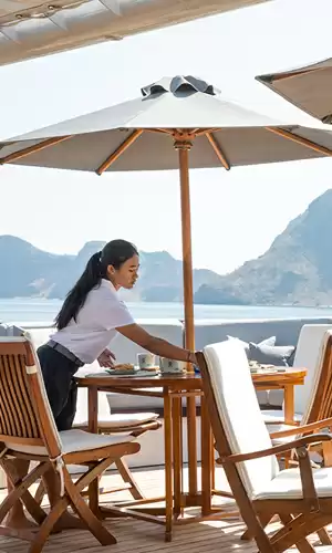 O serviço a bordo é de uma atenção inigualável, antecipando os mínimos desejos dos hóspedes. Espaços de convivência generosos, como decks de observação ao ar livre, salas de projeção privadas e bibliotecas, contribuem para criar um ambiente de luxo descontraído, propício à troca de experiências e à contemplação.