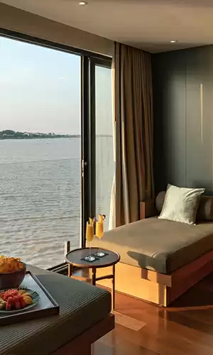 As suítes a bordo dos navios da Aqua Expeditions, como o Aqua Nera ou o Aqua Mekong, são concebidas para oferecer total privacidade sem nunca perder a ligação visual com a natureza. Cada suíte é uma obra-prima de design, muitas vezes decorada com artesanato local de alta qualidade. A característica principal são as imensas paredes de vidro que transformam o quarto num ecrã de cinema vivo sobre o mundo exterior. Dotadas de casas de banho luxuosas, roupa de cama premium e, em algumas, varandas privadas, estas suítes garantem um descanso absoluto ao longo da água, num luxo discreto e acolhedor.