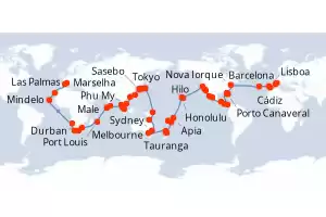Itinerário : Marselha, Barcelona, Cádiz, Lisboa, Ponta Delgada, Nova Iorque, Porto Canaveral, Porto Everglade, Celebration Key, Colon - Panama, Puntarenas, Puerto Quetzal, Porto Vallarta, Cabo San Lucas, San Diego, Los Angeles, São Francisco, Hilo, Honolulu, Apia, Suva, Nukualofa, Tauranga, Auckland, Baia das Ilhas, Melbourne, Sydney, Cairns, Rabaul, Tokyo, Shimizu, Kobe, Sasebo, Pusan, Keelung, Hong Kong, Phu My, Singapura, Port Klang, Penang, Langkawi, Phuket, Colombo, Male, Port Louis, Durban, Port Elizabeth, Le Cap , Walvis Bay, Mindelo, Las Palmas, Barcelona, Marselha