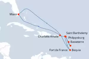 Itinerário : Miami, Charlotte Amalie, Saint Barthelemy, Saint Johns, Fort de France, Basseterre, Philippsburg, Bequia, Miami
