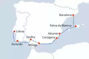 Itinerário : Barcelona, Palma de Maiorca, Alicante, Cartagena, Málaga, Sevilha, Portimão, Lisboa