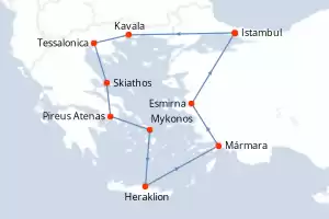 Itinerário : Istambul, Kavala, Tessalonica, Skiathos, Pireus Atenas, Mykonos, Heraklion, Mármara, Esmirna, Istambul