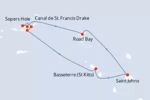 Itinerário : Saint Johns, Gustavia, Canal de St. Francis Drake, Norman Island, Sopers Hole, Ilhas Virgens, Spanish Town, Jost Van Dyke, Road Bay, Basseterre (St Kitts), South Friar s (praia), Saint Johns